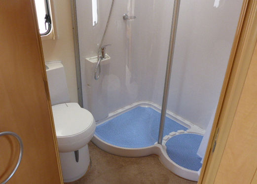 2 BERTH END BATHROOM WITH A GOOD SIZED SHOWER, TOILET AND HAND BASIN.